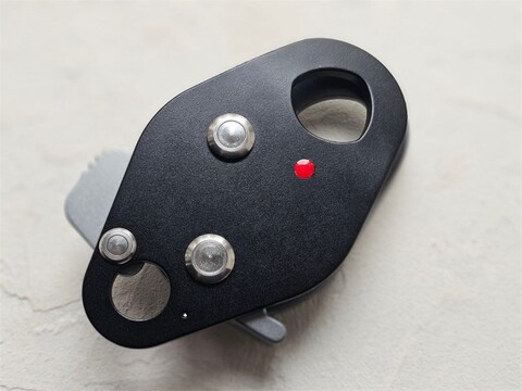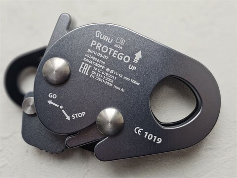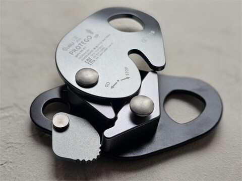 Страховочный зажим типа "капля", коромыслового типа. Перемещается вслед за пользователем по страховочной веревке и блокируется при его срыве.